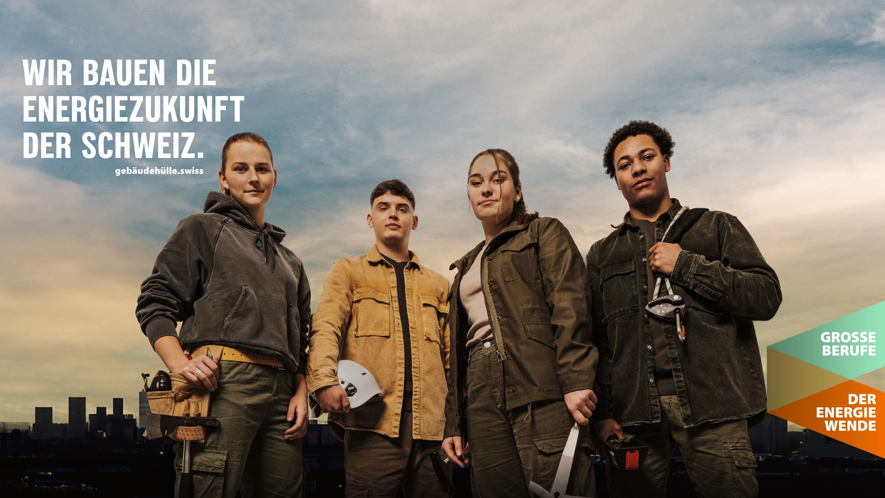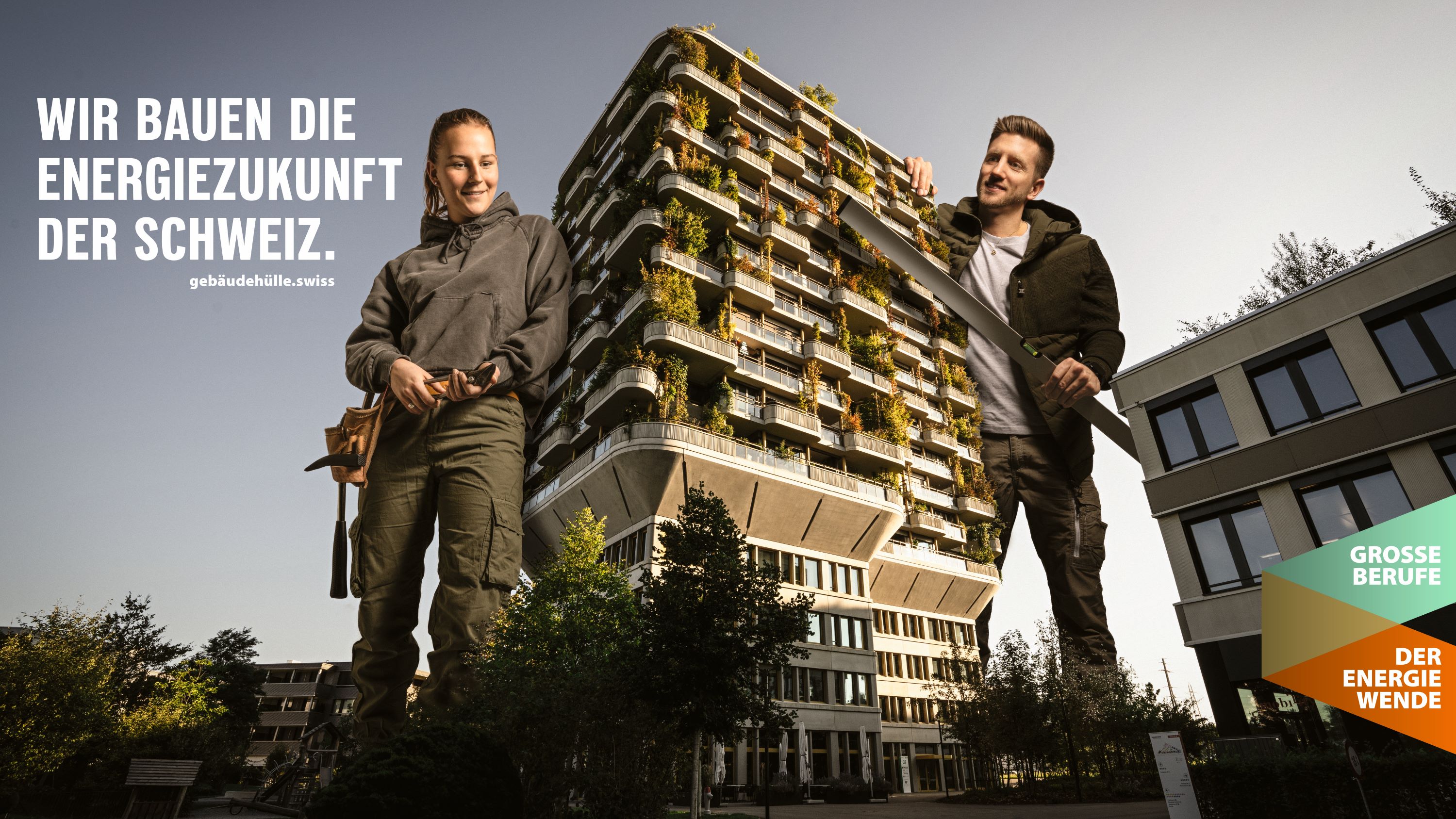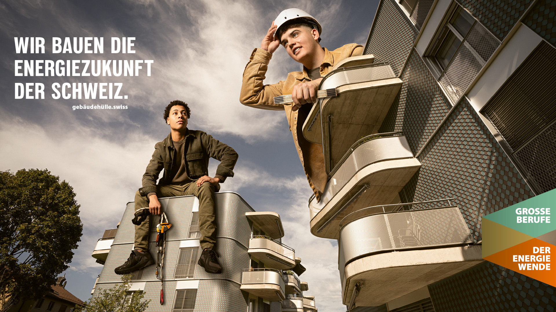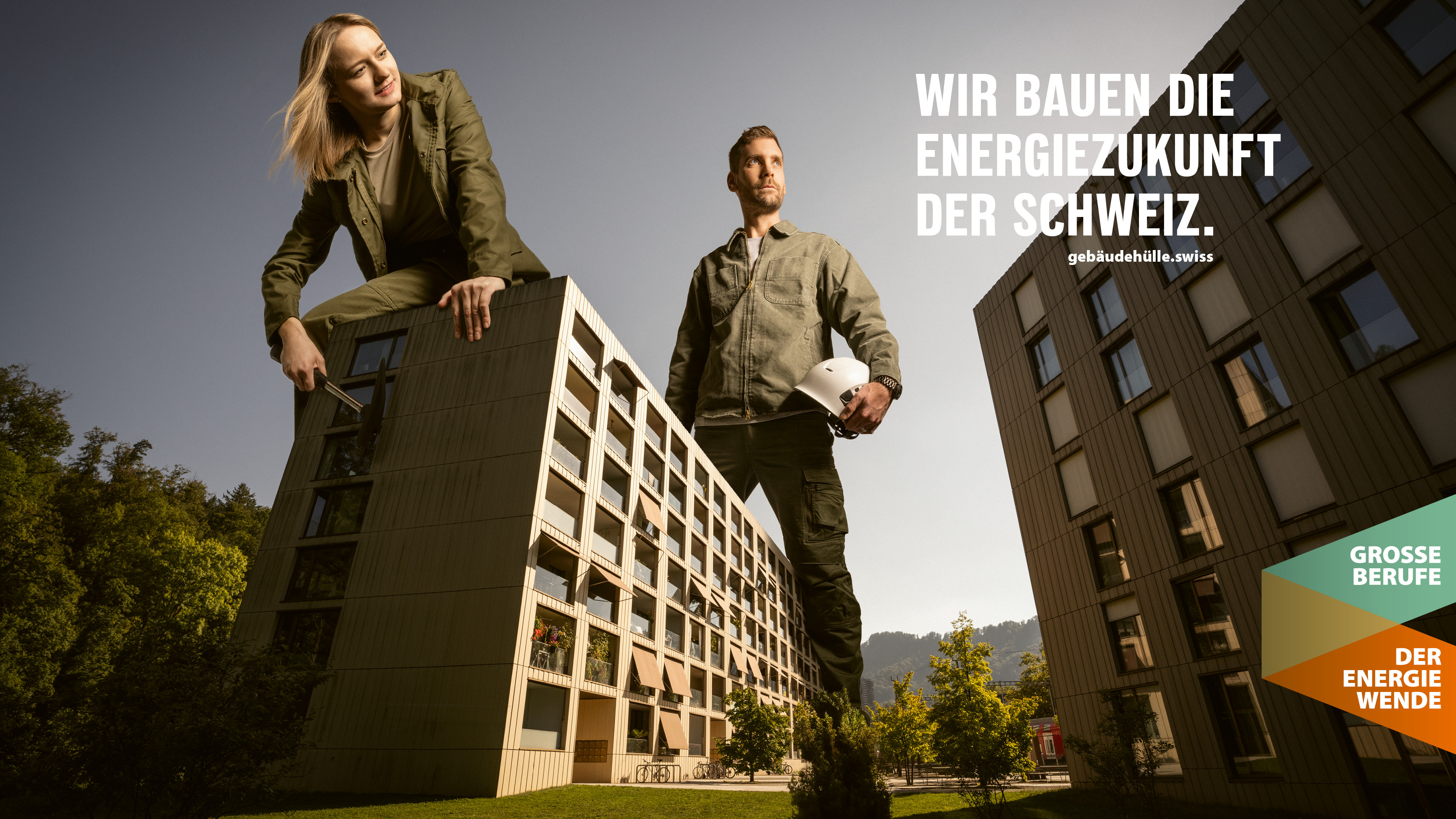 ... und bieten in diesem Zusammenhang grosse und sinnstiftende Berufe an. Gemeinsam bauen wir die Energiezukunft der Schweiz. Diese Kampagne dient als Brückenelement zwischen gebäudehülle.swiss und hoch-hinaus.ch und hat das übergeordnete Ziel, das Image der Gebäudehüllen-Branche mittelfristig positiv zu beeinflussen.
